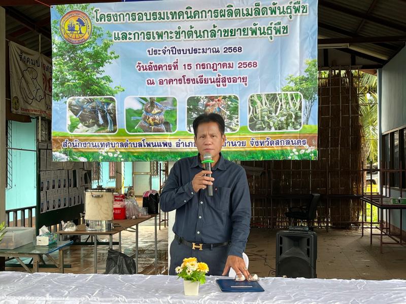 วันที่ 15 กรกฎาคม 2568 นายสมเพชร ลาบัวใหญ่รองนายกเทศมนตรีตำบลโพนแพง เป็นประธานเปิด โครงการฯ พร้อมด้วยทีมผู้บริหาร สมาชิกสภาเทศบาล รองปลัดเทศบาล รักษาราชการแทนปลัดเทศบาลตำบลโพนแพง หัวหน้าส่วนราชการ เจ้าหน้าที่เทศบาลตำบลโพนแพง และผู้เข้าอบรม เข้าร่วมโครงการอบรมเทคนิคการผลิตเมล็ดพันธุ์ประจำปีงบประมาณ 2568 ณ อาคารโรงเรียนผู้สูงอายุ