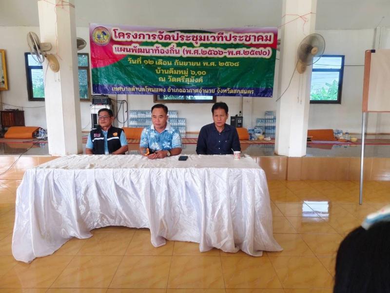 โครงการการจัดประชุมเวที่ประชาคม แผนพัฒนาท้อง ถิ่น (พ.ศ.2566-2570) วันที่ 12 กันยายน 2568 นายเสมอ จำรักษา นายกเทศมนตรีตำบลโพนแพง พร้อมด้วยคณะผู้บริหารสมาชิกสภาเทศบาลตำบลโพนแพง รองปลัดเทศบาล รักษาราชการแทนปลัดเทศบาลตำบลโพนแพง หัวหน้าสำนักปลัด นิติกร นักวิเคราะห์นโยบายและแผน นักวิชาการสุขาภิบาล เจ้าหน้าที่ตำบลโพนแพง ผู้นำชุมชน และชุมชน เข้าร่วมรับฟังโครงการจัดประชุมเวทีประชาคม แผนพัฒนาท้องถิ่น (พ.ศ.2566-2570) ณ บ้านคึม หมู่ 6และ หมู่ 10 วัดศรีสุมัง